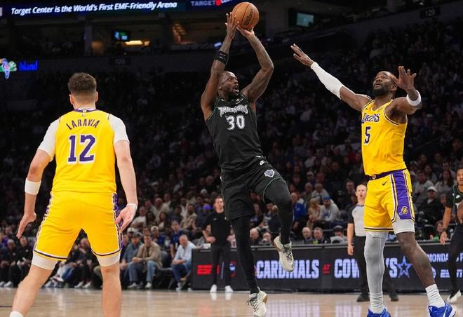 北京时间10月30日,NBA常规赛西部焦点战,湖人客场挑战森林狼队。本场比赛之前,两队战绩都是2胜2负。对于湖人来说,老詹还没有复出,东契奇也在此前受伤缺席,球队的带队重担自然来到里夫斯手里,而里夫斯也是不负众望,4场常规赛场均砍下35.8分6.8篮板8.5助攻,简直就是超巨水平。对于一个落选秀起点,身体天赋平平,还从未进过全明星的里夫斯来说,他的火热状态能否延续下去呢?另一边的森林狼,也算西部强队之一,过去两年他们都打进西部决赛,有强势崛起的苗头,队内爱德华兹+兰德尔+戈贝尔都有全明星实力。